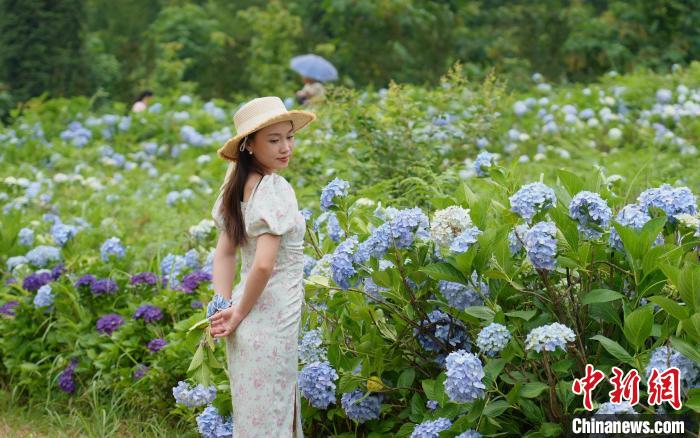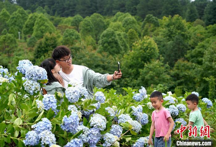 6月15日,贵州省黔南布依族苗族自治州龙里县龙架山国家森林公园雨后吹过阵阵微风,游客趁着凉爽的天气,在公园的绣球花海中游玩、拍照,乐享夏日悠闲时光。图为游客在绣球花海中拍照。石小杰 摄